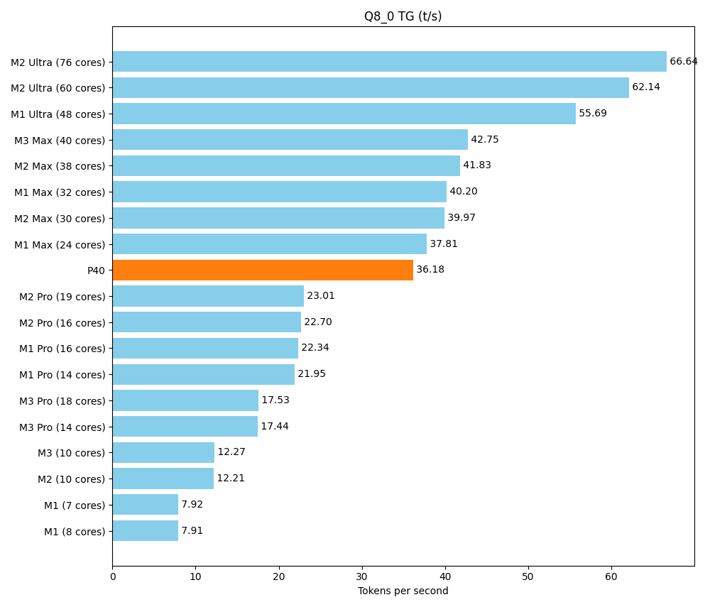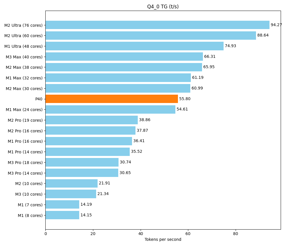 Als Referenz nutzen wir ein ausführliches Community-Benchmark der verschiedenen Apple-Produkte. Hier wird ein kleineres Modell (Llama 7B v2) getestet. Es lässt sich auf unserem Setup vielfach parallel ausführen, aber dennoch ist auch die maximale Geschwindigkeit entscheidend.